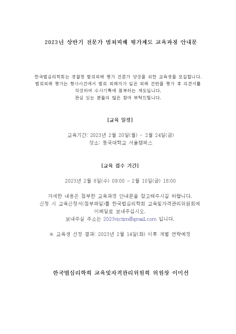 2023년 상반기 전문가 범죄피해 평가제도 교육과정 안내